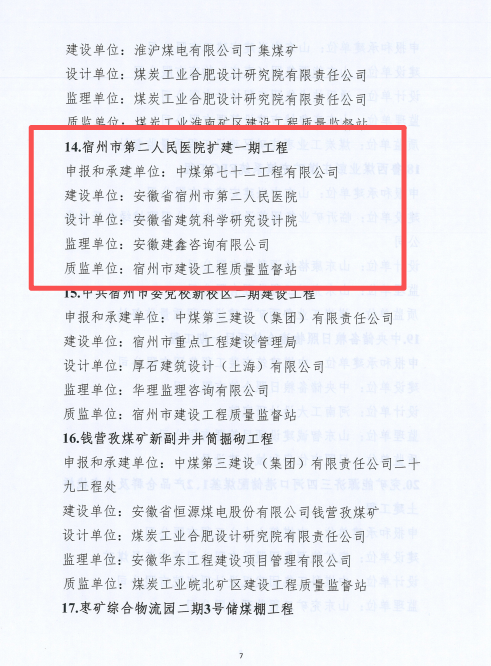 近日,公司承建并申报的宿州市第二人民医院扩建一期工程,成功斩获2025年度煤炭行业建设工程质量高等级优良工程(经典)殊荣。该奖项是煤炭行业工程质量的权威认证,此次获奖不仅彰显了项目建设在煤炭领域的高品质,更标志着公司工程建造与质量管理水平获得行业高度认可。