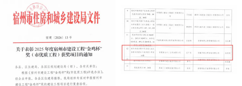 近日,从宿州市住房和城乡建设局网站获悉,公司承建的宿州市城市棚户区改造工程大泽路西安置区(浍泽园)项目 3#楼工程获得2025年度宿州市建设工程“金鸡杯”奖。